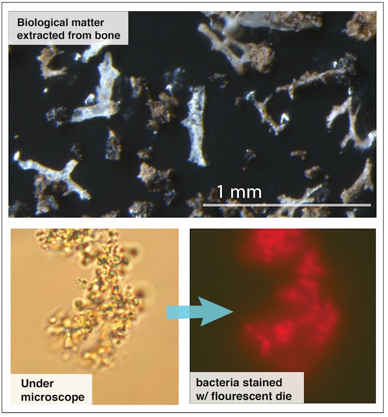 To find out what lived in the bones, we extracted DNA and the related molecule RNA from the fossil. What we found was astonishing: a thriving community of bacteria. The bones had 50 times the bacterial DNA as the surrounding mudstones. They weren’t empty tombs, but teeming with a unique microbial community, a microbiome. Bones, unlike rock, have open spaces for marrow, blood vessels and cells, which now create space for microbes, and carry water and nutrients. Bone also contains phosphorus needed to make DNA and cell membranes.