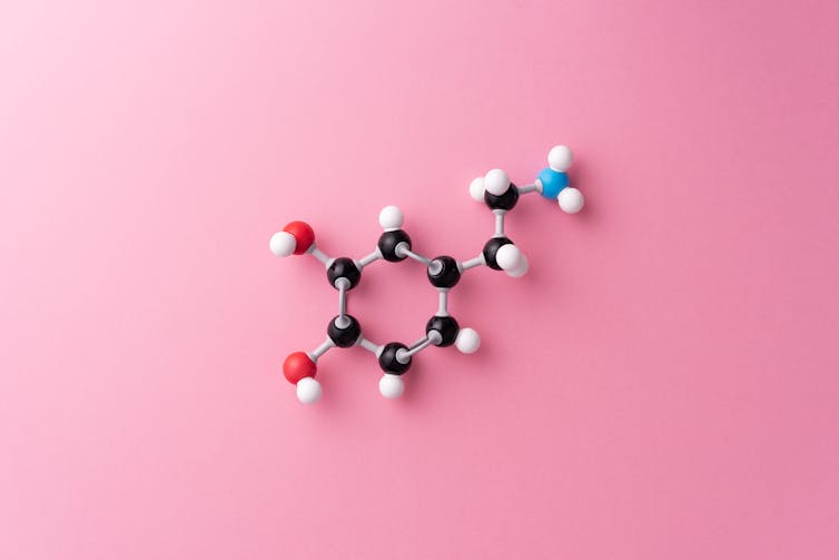 Dopamine is a neurotransmitter – a chemical messenger produced in the brain. It is sent around the brain conveying signals related to functions such as motor control, memory, arousal and reward processing. For example, too little dopamine can result in disorders like Parkinson’s Disease, involving symptoms of muscle rigidity, tremors and changes in speech and gait. One of the treatments for Parkinson’s is the drug L-DOPA, which can cross the blood-brain barrier and be converted into dopamine to help ease the symptoms.