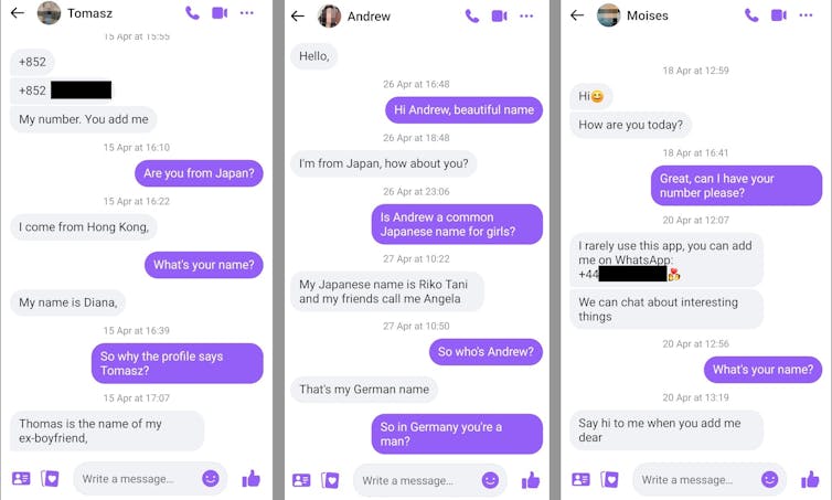 Things got even weirder quickly. Not only did the text messages look very similar, but also the profile names including Lily, Sandra, and Miriam gradually turned to Tomasz, Moises and Andrew, as I continued liking and matching on the app. When I asked “Andrew” from Japan if “her” name is common for girls in Japan, she said it’s her German name. Tomasz, aka Diana, said it’s her ex-boyfriend’s name and Moises didn’t reply.