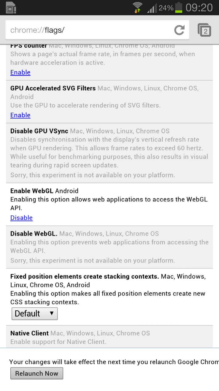 To enable WebGL support, all you have to do is download the latest Chrome Beta from the Google Play store. Once installed, enter “chrome://flags/” (minus the quotes) into the URL bar, scroll down to ‘Enable WebGL’ and relaunch the browser.