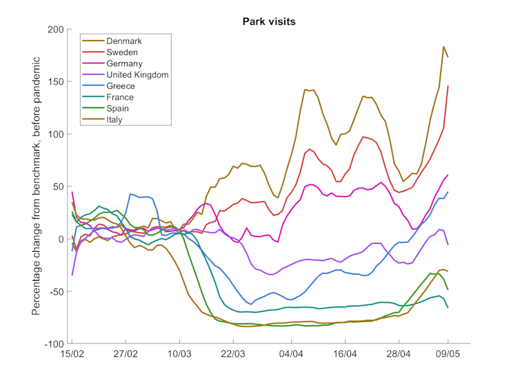 Germany’s park visit data is further evidence that lockdown measures do not fully determine behavior, and that people have their own motives. Its graph line is somewhat similar to Denmark’s and Sweden’s, countries with less strict official policies; the country with the most similar policy on going outdoors was the UK, whose line shows a decrease instead of an increase.