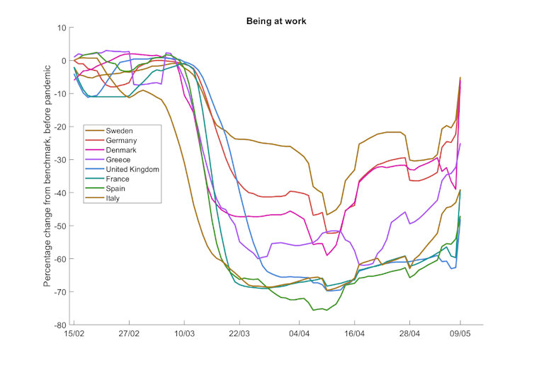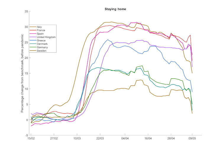 For a good part of April, all these countries except for Sweden were officially in some form of lockdown, with measures in place banning non-essential movement. However, behavior varied substantially.