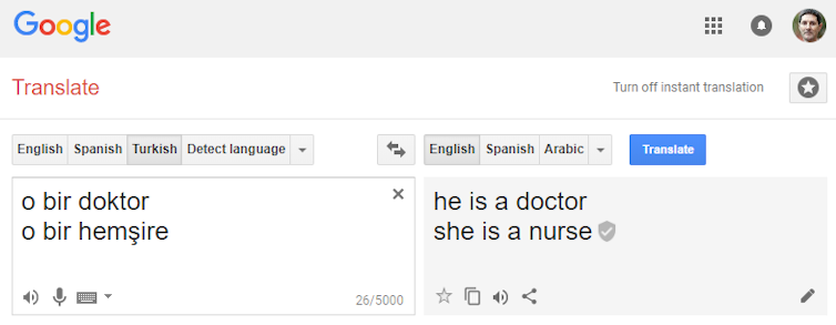 When used, for example, to translate the Turkish phrases “o bir doktor” and “o bir hemşire” into English, Google’s service returns the results “he is a doctor” and “she is a nurse”. But “o” is a gender-neutral third-person pronoun in Turkish. The presumption that a doctor is male and a nurse is female reflects cultural prejudices and the skewed distribution of gender in the medical profession.