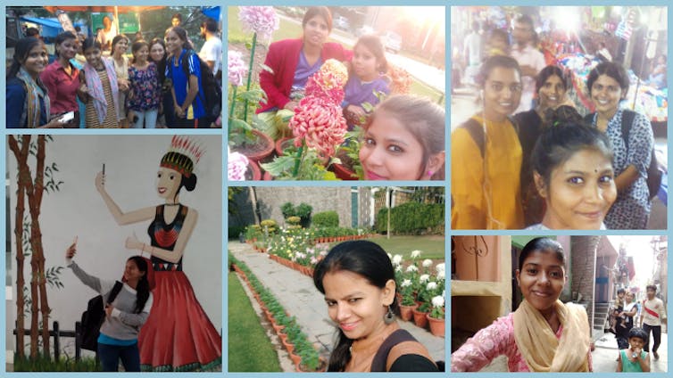 But by recording women’s presence at a particular time and place, these selfies also give away what, when and where the women cannot be. For example, selfies are mostly taken during the day, or when they are with a group of friends, in places where there are fewer men, or in familiar neighborhoods where they feel comfortable and confident. Very rarely do these women take selfies when they travel alone, – because sexually predatory male attention remains a constant feature of their journeys.