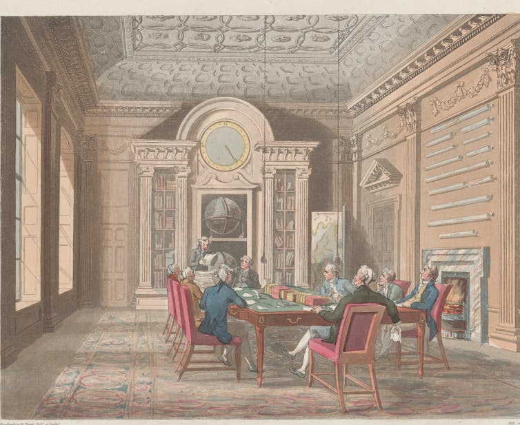 The public areas within the building included a spacious hall and courtyard used as a reception for sales and meetings, with large rooms for the directors and offices for the clerks. An elite group of established clerks at the East India Company administered the growth of company commerce in London and thousands of miles away in East Asia.