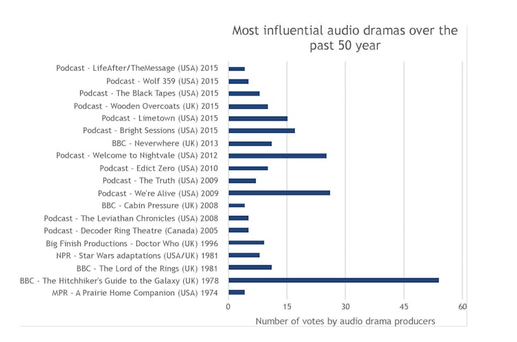 In a survey I conducted of 140 audio drama producers, of the 20 podcasts cited, Hitchhiker’s Guide remains the most frequently stated source of inspiration. The oldest of the 20, it was a ground-breaking production. However, it is notable that over half of the podcasts mentioned are from the last ten years.