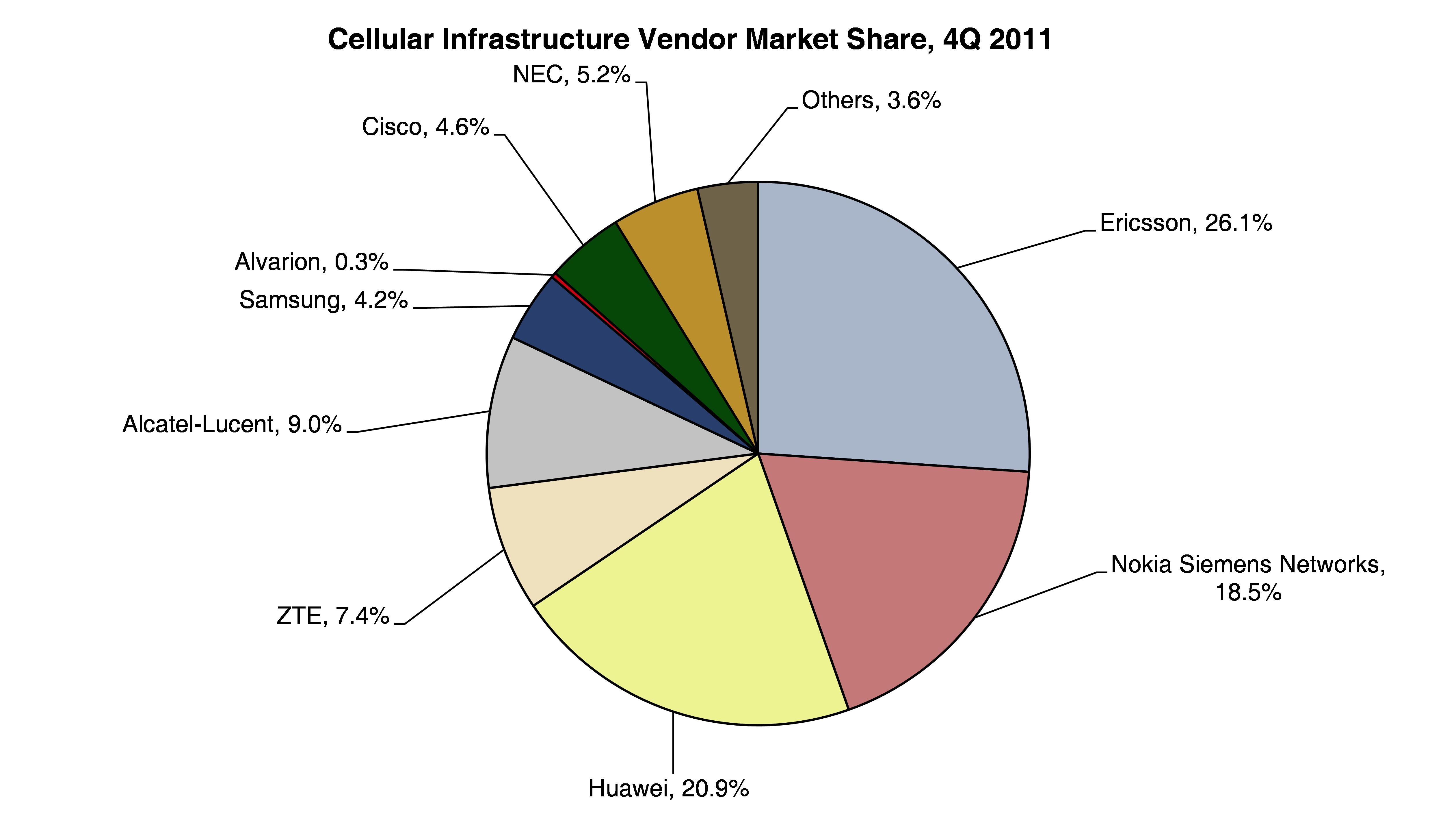 Such is its progress that Huawei is now ranked second in the industry, according to ABI, having overtaken Nokia Siemens Networks to take the spot. With a 20.9 percent market share, it remains behind long-term industry leader Ericsson, however, which holds 26.1 percent.