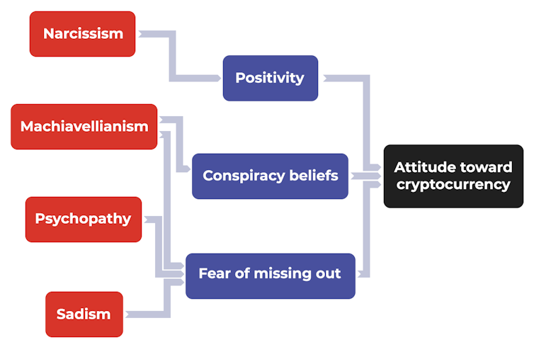 We measured their dark tetrad traits using standard psychological tests. We also measured traits that might connect the dark tetrad to judgments about crypto: fear of missing out (FOMO; the feeling that others are experiencing better things than you are), positivity (the tendency to be positive or optimistic in life), and belief in conspiracy theories.