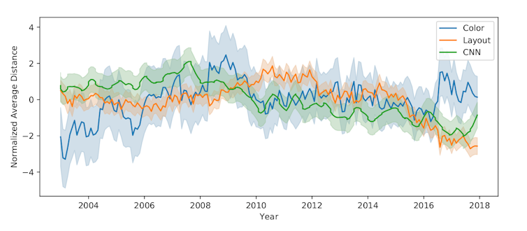We found that across all three metrics – color, layout and AI-generated attributes – the average differences between websites peaked between 2008 and 2010 and then decreased between 2010 and 2016. Layout differences decreased the most, declining over 30% in that time frame.