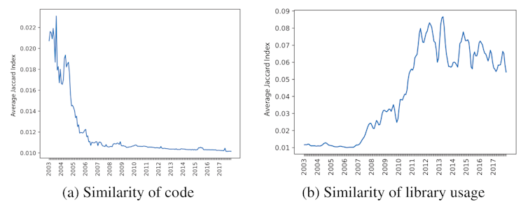 You might think that these sites are simply copying each other’s code, but code similarity has actually significantly decreased over time. However, the use of software libraries has increased a lot.
