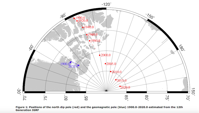 Since Earth’s magnetic field is created by its moving, molten iron core, its poles aren’t stationary and they wander independently of one another. In fact, since its first formal discovery in 1831, the north magnetic pole has travelled over 2,000km from the Boothia Peninsula in the far north of Canada to high in the Arctic Sea. This wandering has generally been quite slow, around 9km a year, allowing scientists to easily keep track of its position. But since the turn of the century, this speed has increased to 50km a year. The south magnetic pole is also moving, though at a much slower rate (10-15km a year).