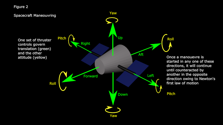 This is complicated by Newton’s first law of motion – that any object at rest or in motion will continue to be so unless acted upon by an external force. That means any manoeuvre, such as a roll to the right, will continue indefinitely in the absence of air resistance to provide an external force until it is counteracted by firing thrusters in the opposite direction.