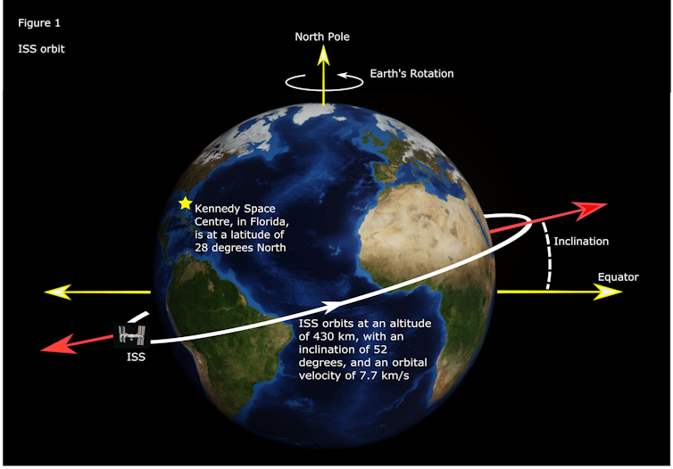The space station has an orbital velocity of 7.7km per second. The Earth’s rotation carries launch sites under a straight flight path of the ISS, with each instance providing a “launch window”.