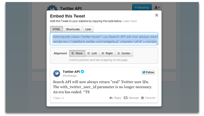 However, if you own a WordPress blog, Twitter and WordPress has made it even easier to embed tweets on your website. Now, tweets can be embedded simply by copy and pasting the Tweet URL, which then turns that URL or a shortcode into a tweet widget.