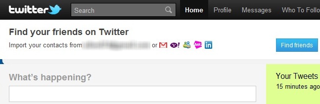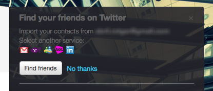 Wanting to capitalise on the number of views the main Twitter timeline page receives, the microblogging service has started to experiment with the placement of friend import notifications, fixing reminders above the Twitter timeline but also in the right column above user friend counts: