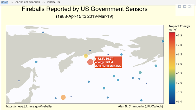 That’s what happened off Russia’s east coast on December 18 last year. A giant explosion occurred above the Bering Sea when an asteroid some ten meters across detonated with an explosive energy ten times greater than the bomb dropped on Hiroshima.
