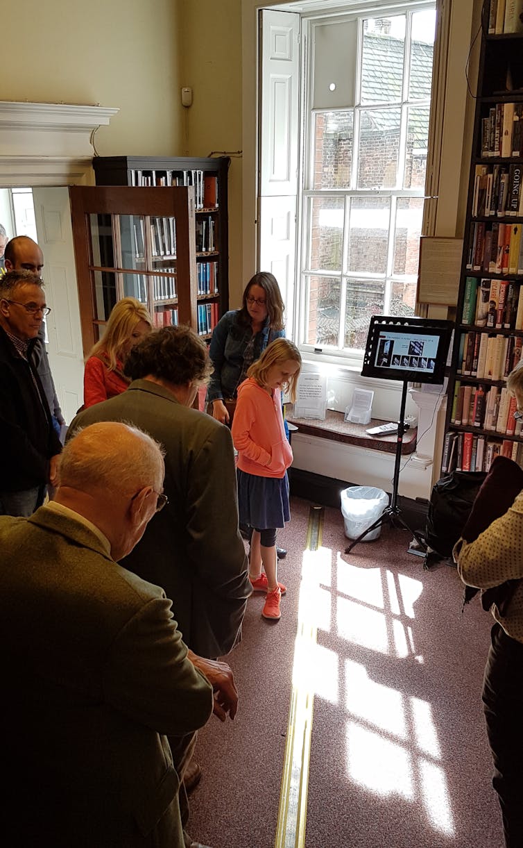 The sun was also long used to set clocks. To do that, only a single instance in time was needed to be marked: the middle of the day. This was achieved through meridian sundials, which have a small opening and a line exactly oriented north-south, the meridian. If the line is crossed, it is local solar noon.